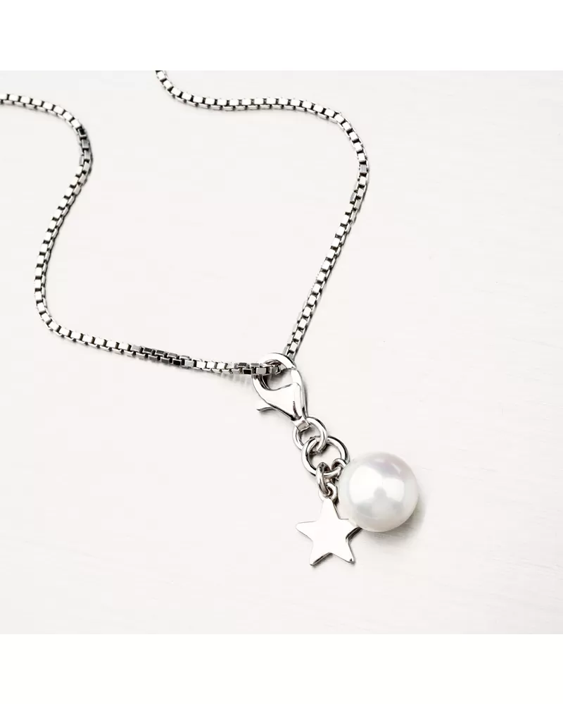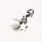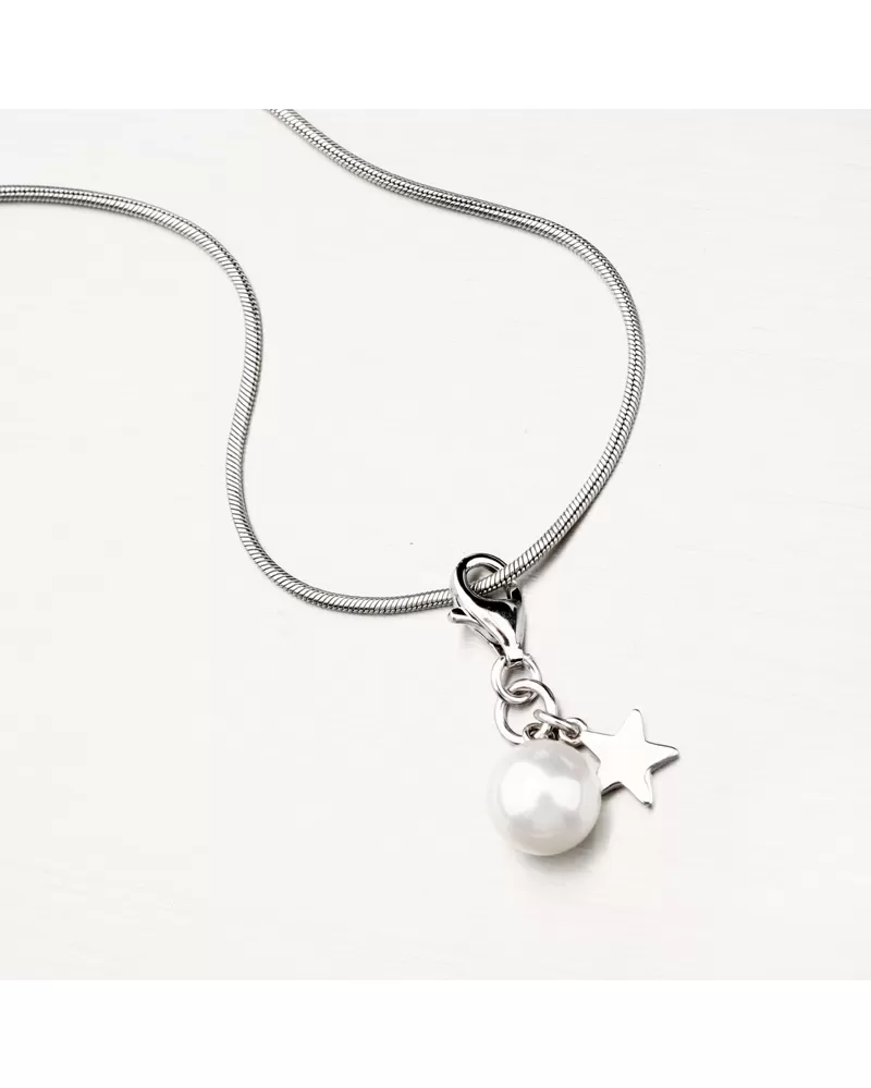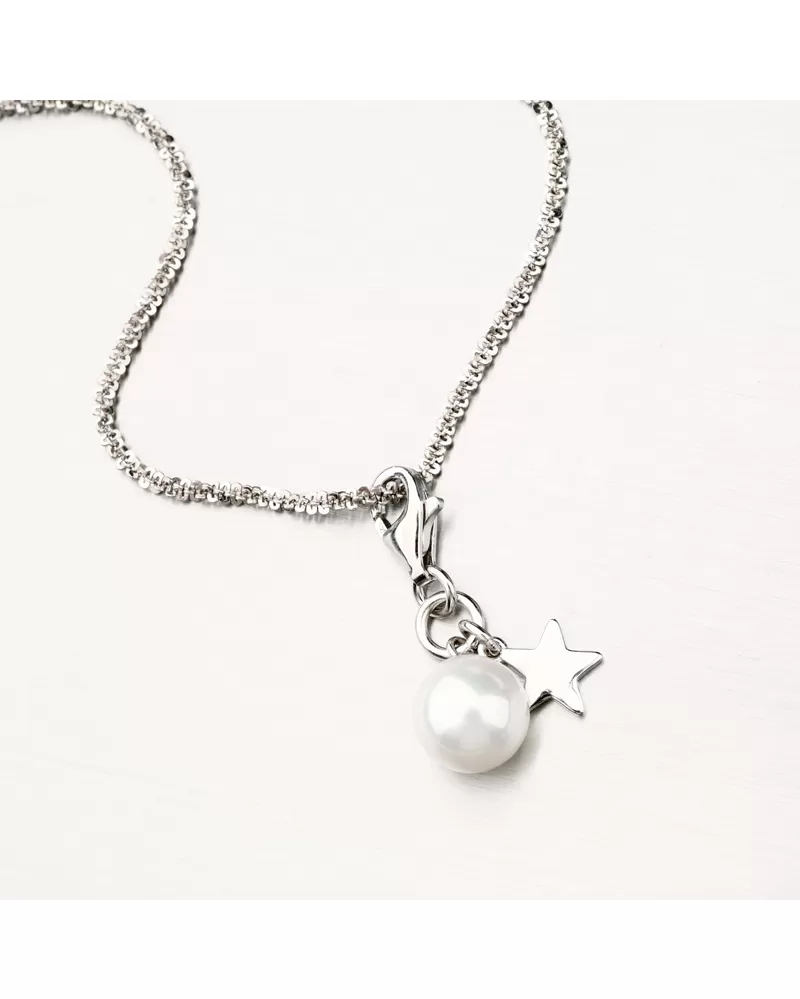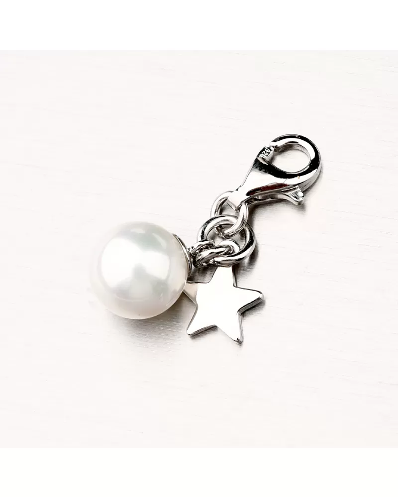 Jemný prívesok na karabínku zdobený jednou žiarivou umelou perlou v bielej farbe a drobnou hviezdičkou v lesklej povrchovej úprave. Prívesok môžete pripnúť ako na retiazku, tak napríklad k náramku.