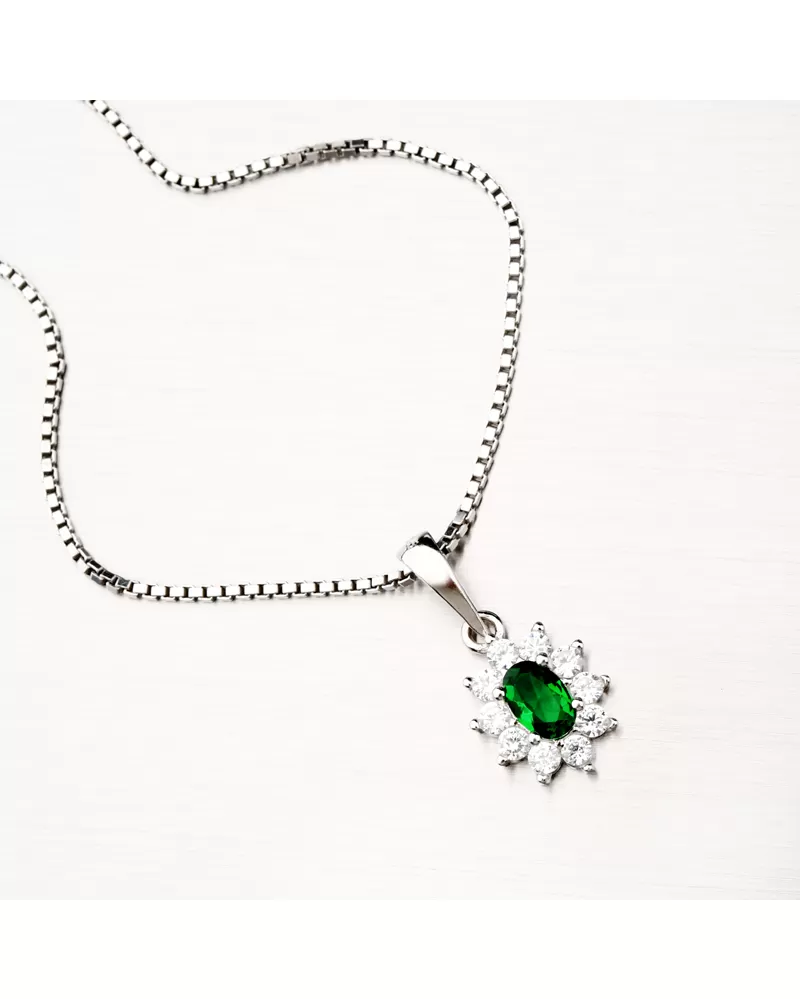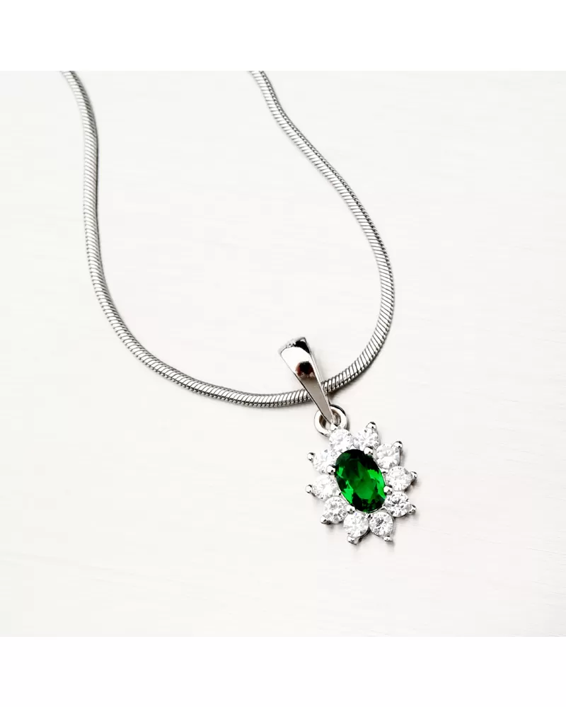 Úchvatný prívesok s dominantným zeleným zirkónom v oválnom tvare, ktorý je na pevno usadený do krapien a okolo neho je vysadených 10 žiarivých zirkónov po celom obvode. Prívesok je veľmi ľahký a bude maximálne pohodlný na celodenné nosenie.