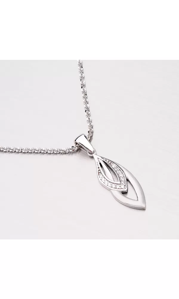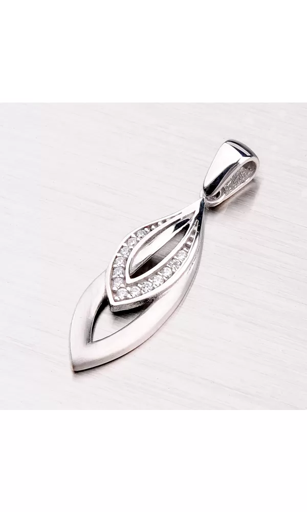 Elegantný prívesok je dekorovaný čírymi zirkónmi, ktoré zaujmú neuveriteľným leskom. Prívesok je v tvare dvoch lístkov, kedy horný lístok je osadený zirkónmi a dolný lístok je bez kameňov v zamatovom mate.