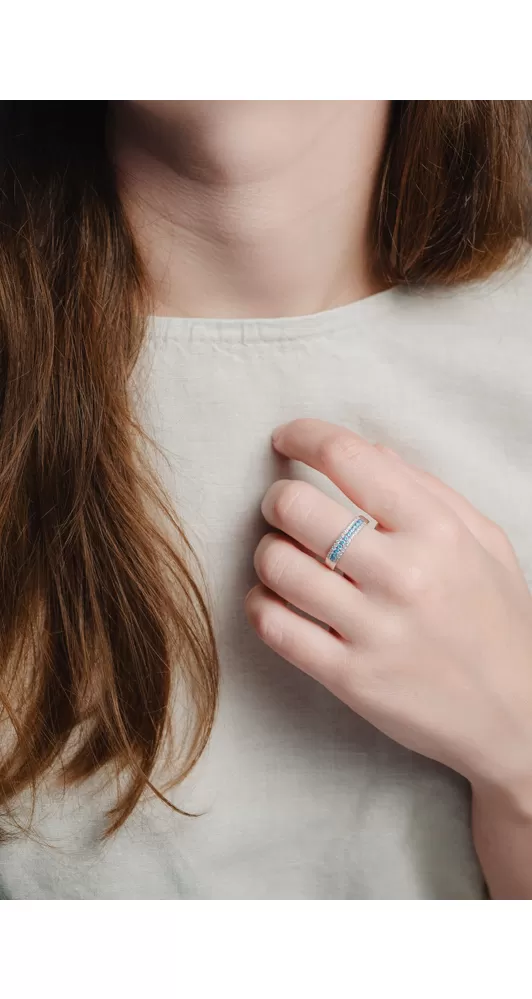 S týmto prsteň zažiarite a to na spoločenských udalostiach, ale aj na bežné každodenné nosenie. Prsteň je na prednej časti osadený nádhernými zirkónmi a to rovno v troch radoch. Horný a spodný rad septembra bielymi zirkónmi a prostredný rad vyniká syntetickými akvamarínmi vo svetlo modrej farbe. Zirkóny nevyčnievajú a vy sa tak nemusíte báť, že by ste s prsteňom kdekoľvek zatrhli alebo by vám prekážali. Zirkóny sú okrúhleho briliantového brusu, ktorý zaisťuje maximálnu brilanciu vybrúsených facet, dokonale odráža svetlo a neuveriteľne žiari z každého uhla pohľadu. Prsteň má príjemnú váhu, ktorá zaistí pohodlné nosenie po celý deň.