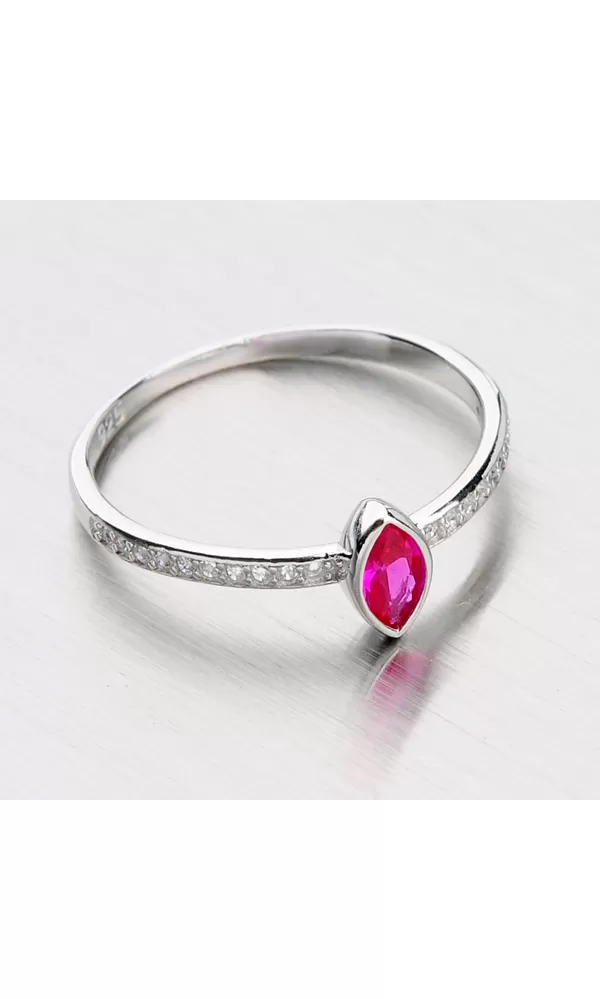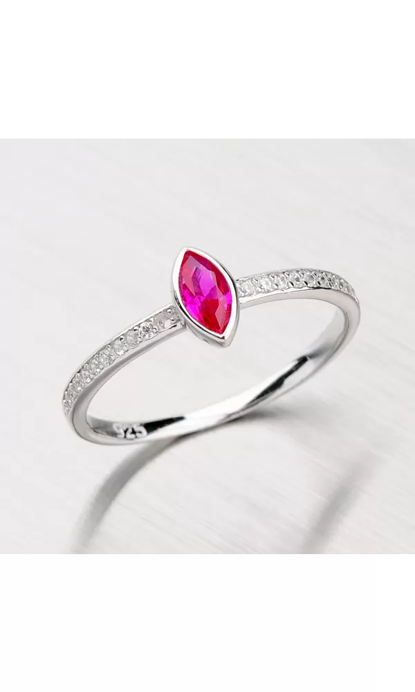 Jemný dámsky prsteň so syntetickým rubínom a bielymi zirkónmi vyrobený zo striebra rýdzosti 925/1000 bude na Vašej ruke priamo žiariť. Rubín je umiestnený v pevnej korunke a zirkóny sú vsadené do obrúčky prsteňa. S prsteňom zaručene zaujmete. Prsteň je vyrobený v lesklej povrchovej uprave zušľachtený rhodiovaním