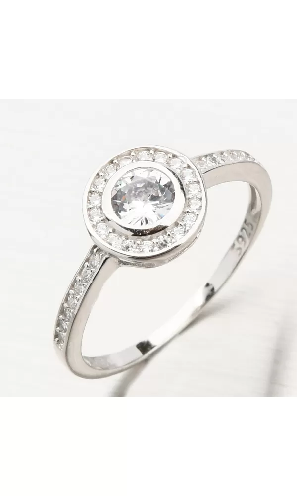 Nádherný šperk pre romantické duše. Prsteň je veľmi elegantný a žiarivý, preto sa Vám bude hodiť všade tam, kde chcete pritiahnuť pozornosť. Prsteň má vo svojom strede hlavný okrúhly zirkón o veľkosti 5,00 mm a potom sú okolo neho osadené po celom obvode jemnejšie zirkóny. Trblietanie kameňov ale pokračuje aj ďalej, pretože sú zirkónmi aj z oboch strán prednej strany obrúčky. Všetky zirkóny sú okrúhleho briliantového brusu, ktorý zaisťuje maximálnu brilanciu vybrúsených facet, dokonale odráža svetlo a neuveriteľne žiari z každého uhla pohľadu. Veľkou výhodou tohto prsteňa je, že sú zirkóny zapustené do prsteňa, nemôže sa Vám teda stať, že by ste zatrhli k oblečeniu, atď. Zároveň je jeho nosenie po celý deň veľmi pohodlné.
