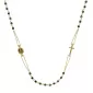 Symbolický moderný náhrdelník ruženec je vyrobený zo žltého 14 karátového zlata. Šperk je zdobený krížikom a medailónikom s Pannou Máriou. Náhrdelník má po obvode malé čierne fazetované korálky, vďaka ktorým je veľmi elegantným kúskom, ktorý vynikne na dekolte.