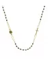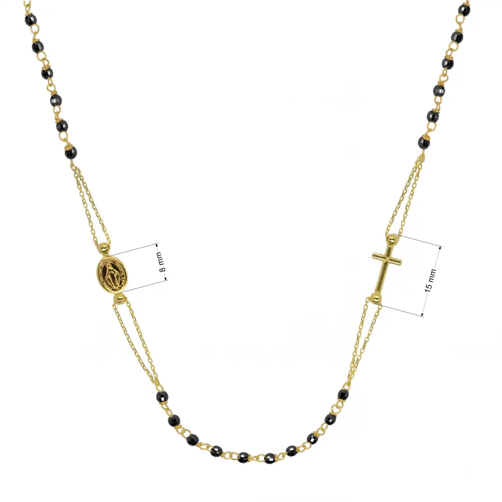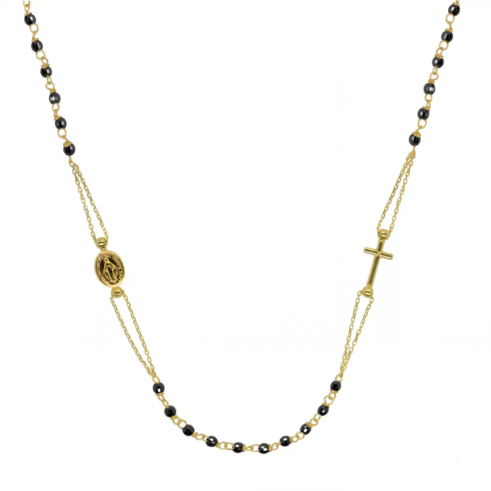 Symbolický moderný náhrdelník ruženec je vyrobený zožltého 14 karátového zlata. Šperk je zdobený krížikom a medailónikom s Pannou Máriou. Náhrdelník má po obvode malé malé čierne fazetované korálky, vďaka ktorým je veľmi elegantným kúskom, ktorý vynikne na dekolte.