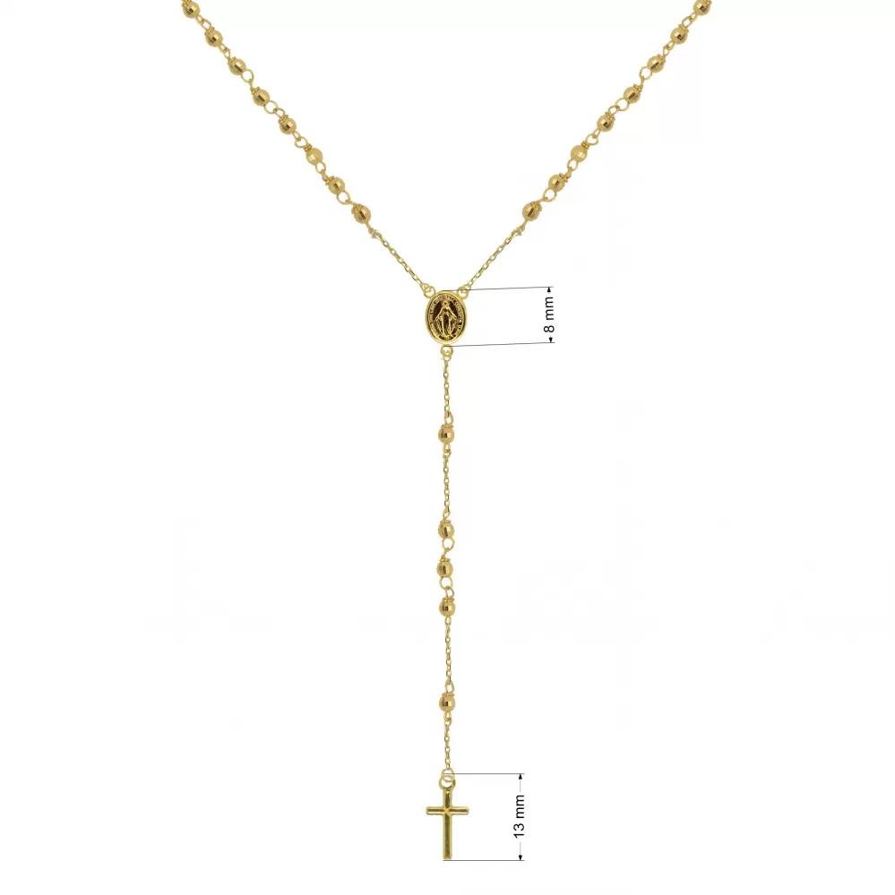 Symbolický moderný náhrdelník ruženec je vyrobený zo žltého 14 karátového zlata. Šperk je zdobený krížikom a medailónikom s Pannou Máriou. Náhrdelník má po obvode malé zlaté fazetované korálky. Klasické zapínanie na perový krúžok zaistí jednoduché a praktické nosenie. Dĺžka náhrdelníka je 49 cm.