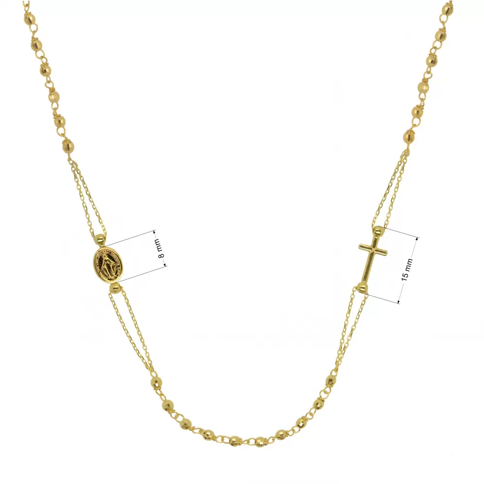 Symbolický moderný náhrdelník ruženec je vyrobený zo žltého 14 karátového zlata. Šperk je zdobený krížikom a medailónikom s Pannou Máriou. Náhrdelník má po obvode malé zlaté fazetované korálky, vďaka ktorým je jemne zladený.