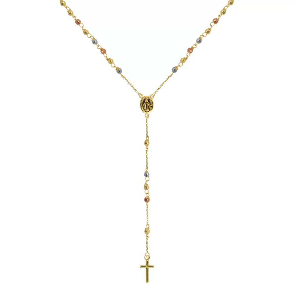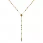 Zlatý náhrdelník ruženec s krížom a medailónkom Panny Márie, zdobený farebnými korálkami, je nádherným a symbolickým šperkom spájajúcim náboženskú tradíciu s eleganciou. Tento výnimočný náhrdelník vyžaruje pokoj a poskytuje priestor pre osobné zbožštenie.
