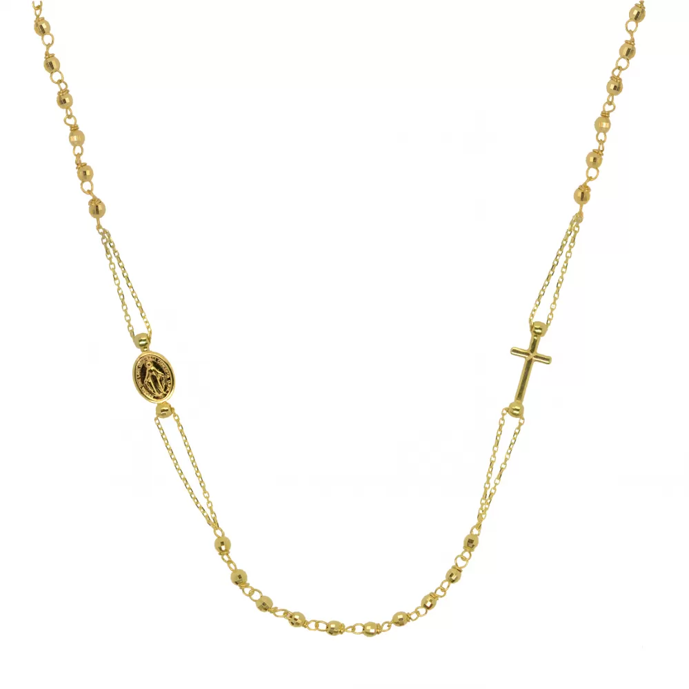 Symbolický moderný náhrdelník ruženec je vyrobený zo žltého 14 karátového zlata. Šperk je zdobený krížikom a medailónikom s Pannou Máriou. Náhrdelník má po obvode malé zlaté fazetované korálky, vďaka ktorým je jemne zladený.