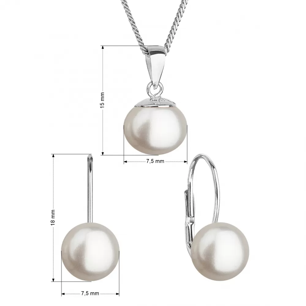 Súprava z bielych riečnych perál obsahuje náušnice a prívesok na striebornej retiazke. Sladkovodné perly, ktorými sú šperky zdobené, majú kvalitu a priemer aa priemer a priemer a priemer a priemer 7,5 mm. Šperky sú vyrobené zo striebra o rýdzosti 925/1000 vrátane povrchovej úpravy ródiom. Súpravu sa nemusia báť zaobstarať ani alergici, pretože šperky neobsahujú žiadny prídavok niklu. Náušnice zapnete na klapku, ktorá ich spoľahlivo ochráni proti nechcenej strate.