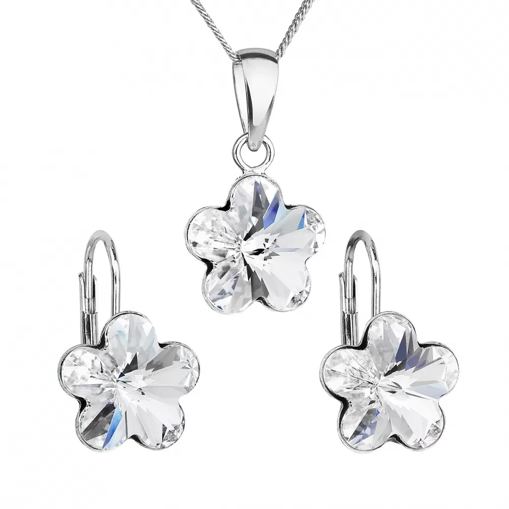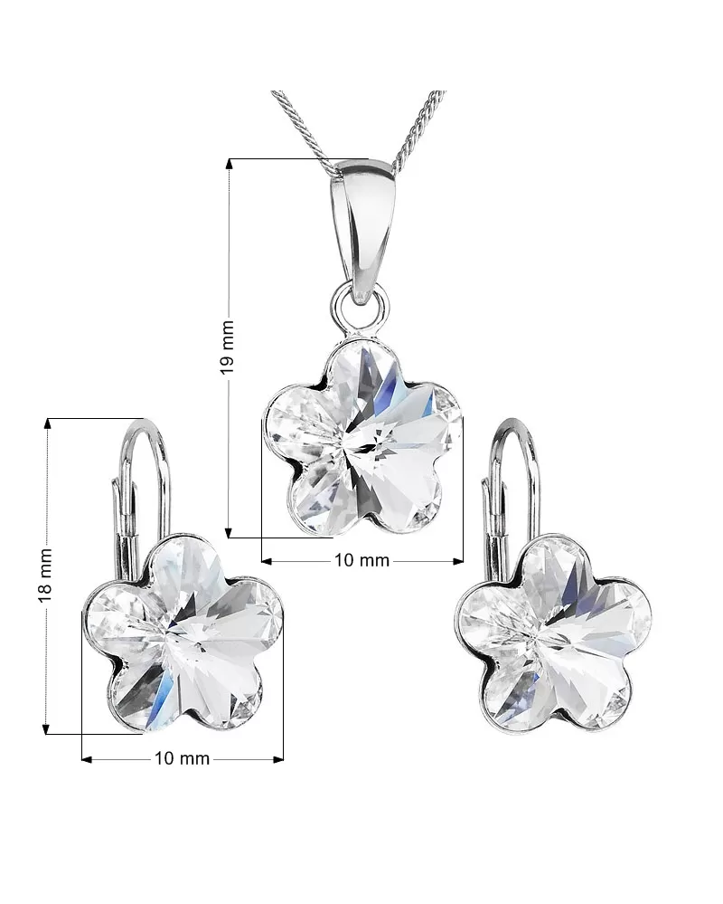 Súprava 39143.1 obsahuje visiace náušnice, prívesok v rovnakom dizajne a retiazku. Šperky sú vyrobené zo striebra rýdzosti 925/1000, ktoré prešlo povrchovou úpravou ródiom. Ródium chráni šperk proti sčernaniu, zožltnutiu i poškriabaniu. Prívesok aj náušnice sú zdobené bielymi Swarovski kryštálmi v tvare kvietky. Náušnice majú zapínanie na klapku. Keďže šperky neobsahujú žiadny prídavok niklu, môžu ich bez obáv nosiť aj alergici.