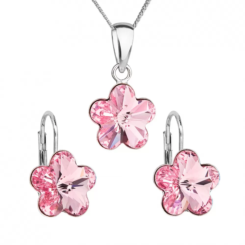 Súprava 39143.3 obsahuje visiace náušnice, prívesok v rovnakom dizajne a retiazka. i poškriabaniu. Prívesok aj náušnice sú zdobené ružovými Swarovski kryštálmi v tvare kytičky. Náušnice majú zapínanie na klapku. Sadu šperkov 39143.3 s kryštálmi Swarovski pre vás ručne vyrobili naše šikovné šperkárky. a Swarovski kryštálov vás presvedčí certifikát pravosti, ktorý je k výrobku priložený.