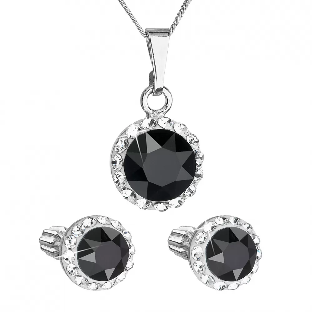 Súprava 39352.3 obsahuje náušnice kôstky a retiazku s príveskom. Šperky sú vyrobené zo striebra rýdzosti 925/1000, ktoré prešlo povrchovou úpravou ródiom. Ródium chráni šperk proti sčerneniu, zožltnutiu i poškriabaniu. Prívesok aj náušnice sú zdobené okrúhlym čiernym Swarovski kryštálom, ktorý je navyše olemovaný ešte malými trblietavými Swarovski kryštálmi v bielej farbe. Náušnice majú zapínanie na spoľahlivý balónik. Keďže šperky neobsahujú žiadny prídavok niklu, môžu ich bez obáv nosiť aj alergici.
