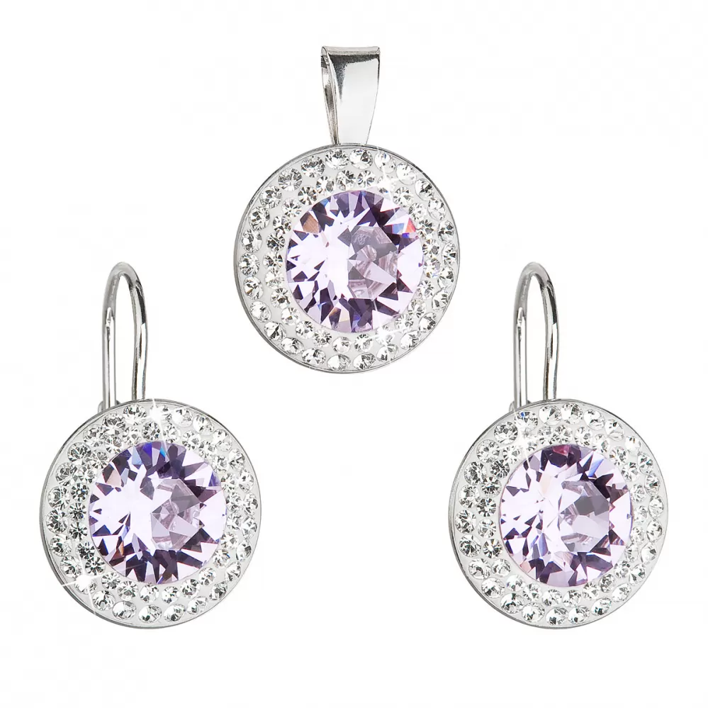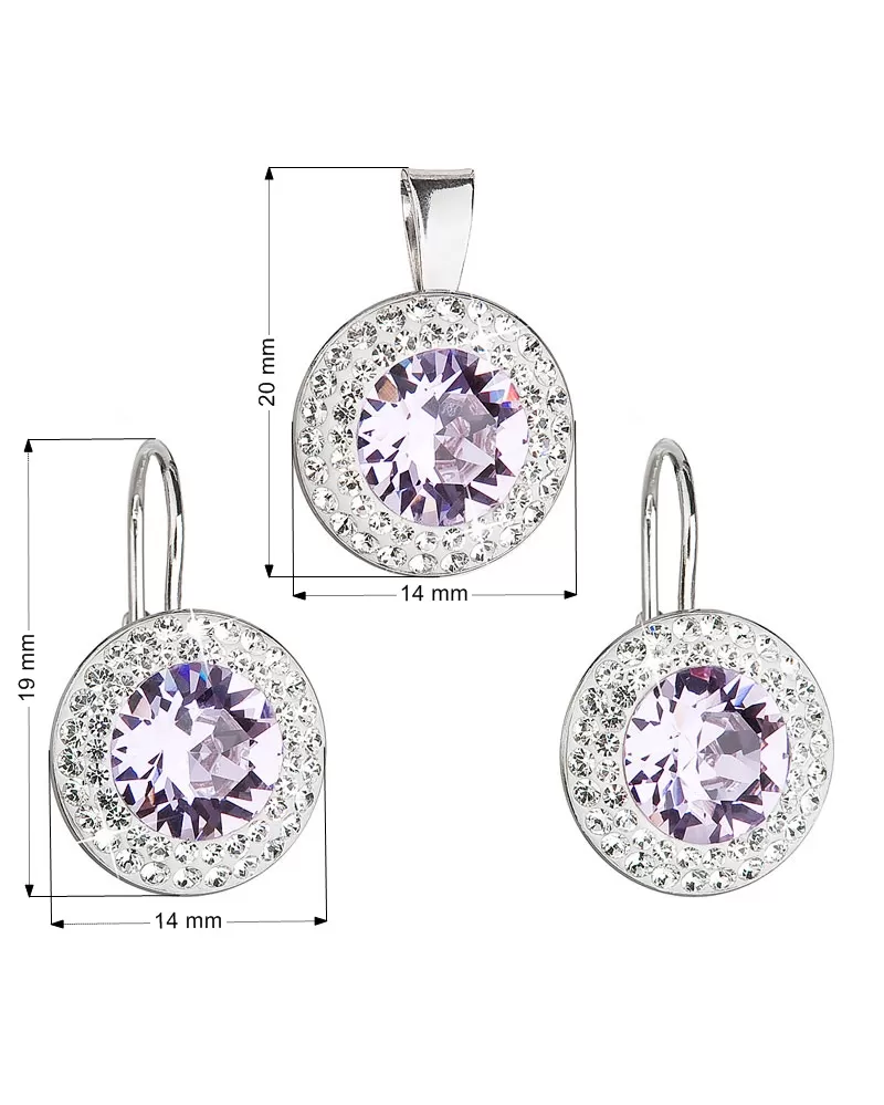 Sada šperkov 39107.3 obsahujeokrúhle visiace náušnice a prívesok v rovnakej podobe. Šperky sú zdobené veľkým okrúhlym Swarovski kryštálom vo fialovej farbe, ktorý je navyše lemovaný dvoma radmi menších bielych kryštálov Swarovski. Šperky zo súpravy 39107.3 sú vyrobené zo striebra rýdzosti 925/1000 vrátane povrchovej úpravy ródiom. Ródium chráni šperk proti sčerneniu, zožltnutiu i poškriabaniu. Náušnice majú zapínanie na klapku. Keďže šperky neobsahujú žiadny prídavok niklu, môžu ich bez obáv nosiť aj alergici.
