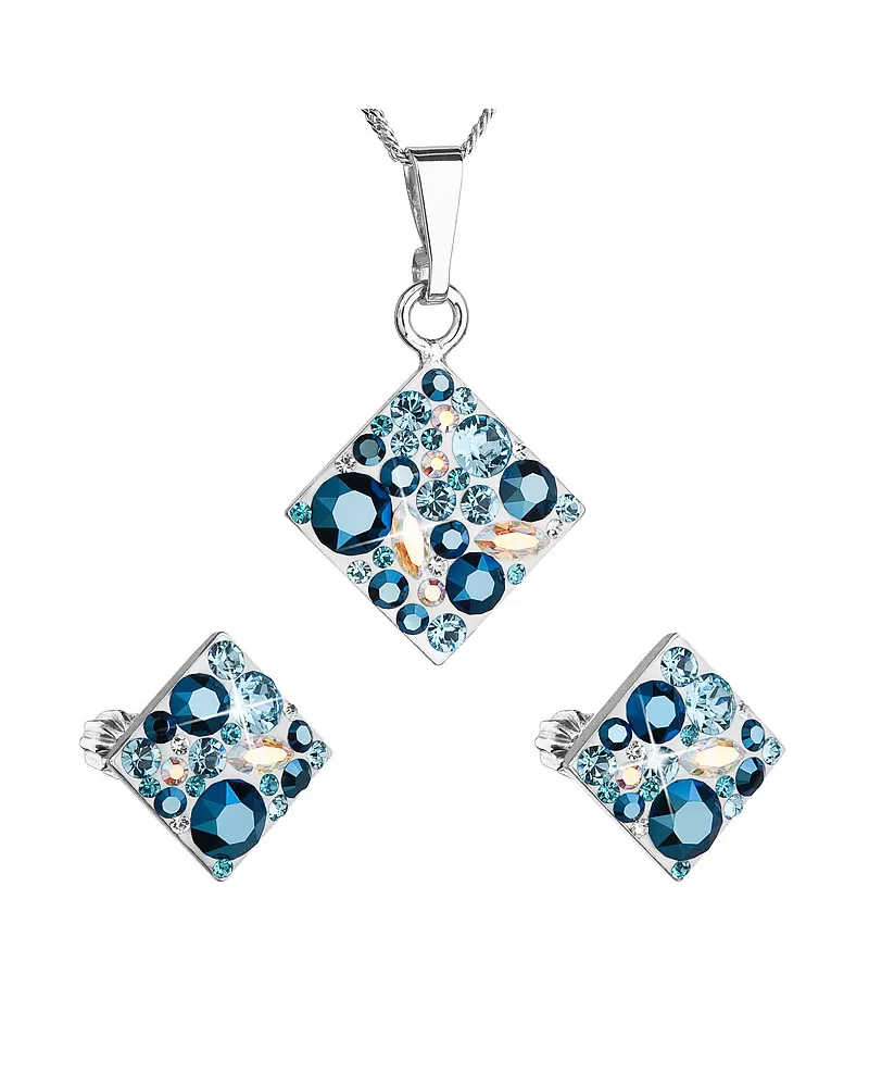 Súprava šperkov 39126.3 aqua obsahuje náušnice kôstky a retiazku s príveskom. Šperky sú v tvare kosoštvorca a sú vyrobené zo striebra rýdzosti 925/1000, ktoré prešlo povrchovou úpravou ródiom. Ródium chráni šperk proti sčerneniu, zožltnutiu i poškriabaniu. Prívesok aj náušnice sú bohato zdobené trblietavými Swarovski kryštálmi v rôznych farbách. Náušnice majú zapínanie na balónik. Keďže šperky neobsahujú žiadny prídavok niklu, môžu ich bez obáv nosiť aj alergici.