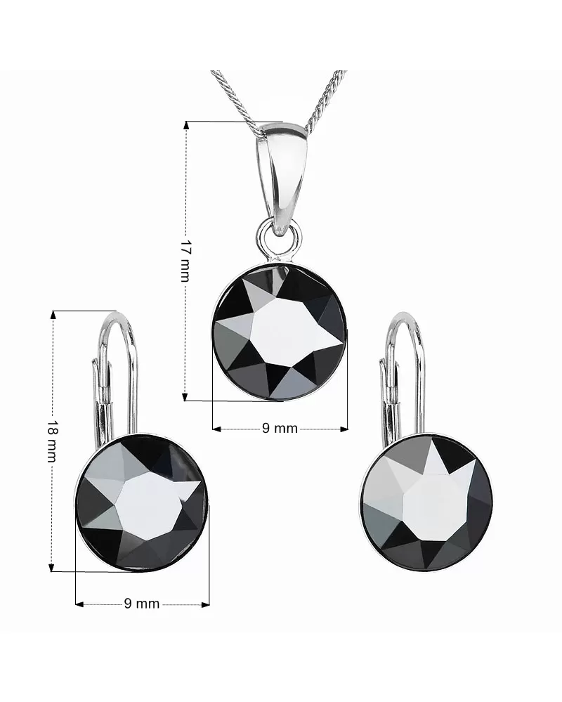 Súprava 39140.5 obsahuje visiace náušnice, prívesok v rovnakom dizajne a retiazku. Šperky sú vyrobené zo striebra rýdzosti 925/1000, ktoré prešlo povrchovou úpravou ródiom. Ródium chráni šperk proti sčernaniu, zožltnutiu i poškriabaniu. Prívesok aj náušnice sú zdobené okrúhlymi Swarovski kryštálmi v čiernej farbe. Náušnice majú zapínanie na klapku. Keďže šperky neobsahujú žiadny prídavok niklu, môžu ich bez obáv nosiť aj alergici.