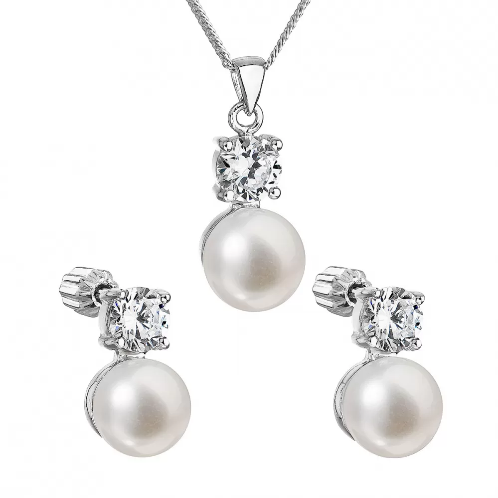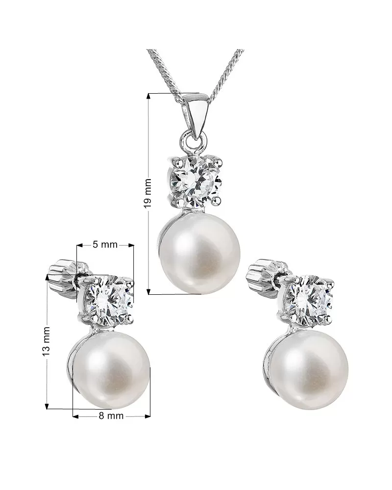 Šperky sú vyrobené zo striebra o rýdzosti 925/1000, sú doplnené veľkou okrúhlou riečnou perlou a vysadené výrazným zirkónom, ktorý im dodá lesk a šmrnc. Perly, ktorými sme šperky ozdobili, spadajú do kategórie najvyššej kvality AAA. Náušnice majú zapínanie na balónik, ktorý ich spoľahlivo ochráni proti nechcenej strate. Súpravu si bez obáv môžu zaobstarať aj alergici, šperky totiž neobsahujú žiadny nikel.