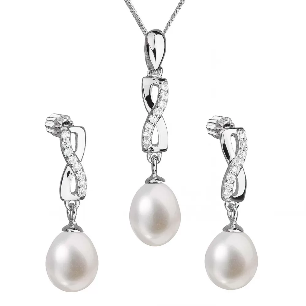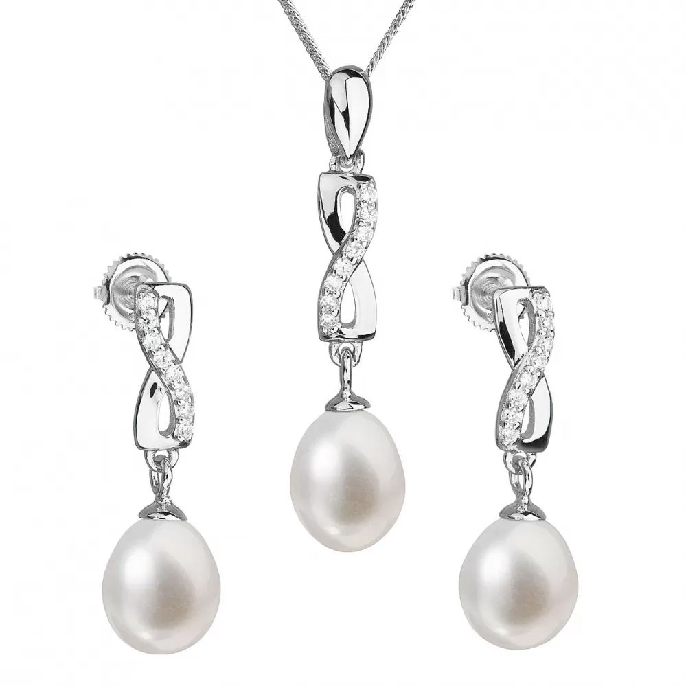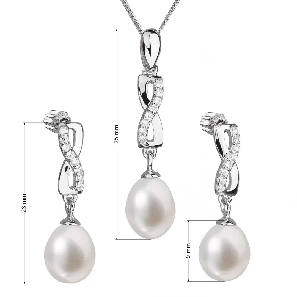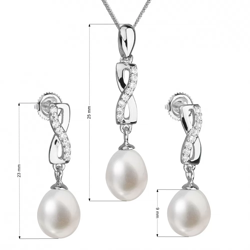 Súprava šperkov sa skladá z visacích náušníc s oválnou riečnou perlou anáhrdelníkom s perlovým príveskom. Strieborné šperky s rýdzosťou 925/1000 majú povrchovú úpravu ródiom a perly, ktorými sú doplnené, spadajú do kategórie kvality AA. Tá sa môže pochváliť veľmi vysokým leskom. Prívesok aj náušnice sú vysadené 8 blýskavými zirkónmi, vďaka ktorým sa šperky nádherne trblietajú. Náušnice sa zapínajú na balónik. Šperky zo súpravy 29041.1 neobsahujú nikel, a tak sú vhodné aj pre alergikov.
