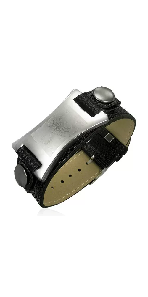 Náramok z chirurgickej ocele s doštičkou uprostred. Náramok je v lesklej povrchovej úprave.