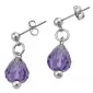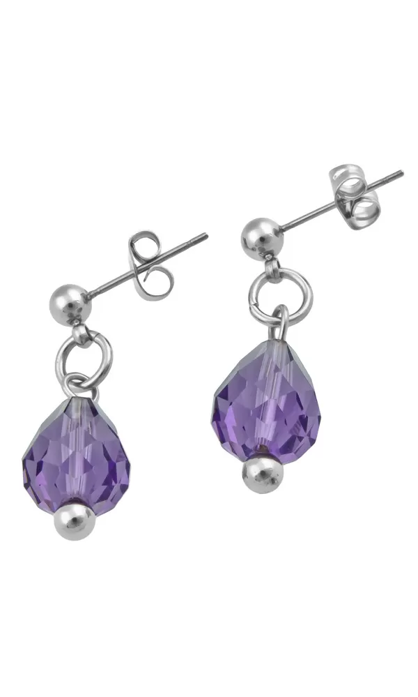 Visiace náušnice z chirurgickej ocele s fialovým korálikom. Náušnice sú v lesklej povrchovej úprave so zapínaním na puzety. Chirurgická oceľ vyniká svojou farebnou stálosťou a nespôsobuje alergické reakcie.
