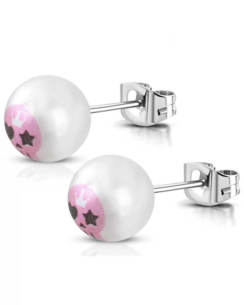 Originálne náušnice kôstky sú zdobené umelou perlou bielej farby. Na umelej perle je vytlačená ružová lebka, ktorá náušnice ozdobí a zvýrazní. Náušnice sú vyrobené z chirurgickej ocele, ktorá je veľmi pevná a odolná. Vyniká aj svojou farebnou stálosťou a tým, že nespôsobuje alergické reakcie, takže je vhodná pre každého. Náušnice s perlou sa zapínajú na puzety.