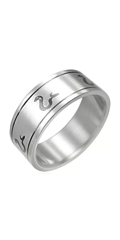 Širší pánsky prsteň je vyrobený z kvalitnej chirurgickej ocele s malými hadmi v čiernej farbe v matnej povrchovej úprave.