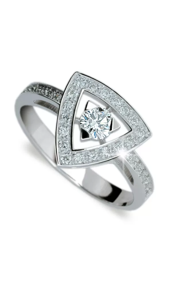 Zásnubný prsteň vyrobený z bieleho štrnásťkarátového zlata rýdzosti 585/1000 v lesklej povrchovej úprave s jedným väčším zirkónom a tridsiatimi menšími okrúhlymi zirkónmi briliantového brusu.