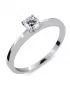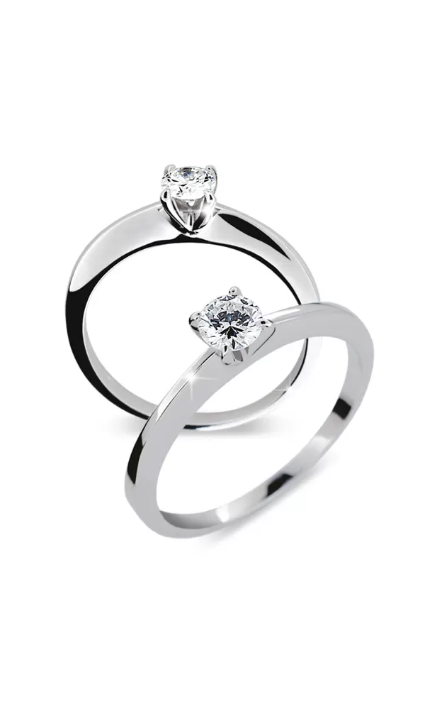 Zásnubný prsteň vyrobený z bieleho štrnásťkarátového zlata rýdzosti 585/1000 v lesklej povrchovej úprave s jedným okrúhlym zirkónom vsadeným do štvorkrapňovej korunky, ktorá nechá krásne vyniknúť brilancii kameňa.