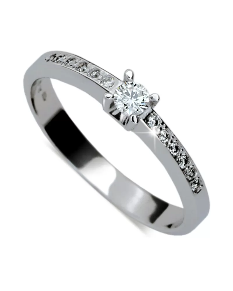 Zásnubný prsteň vyrobený z bieleho štrnásťkarátového zlata rýdzosti 585/1000 v lesklej povrchovej úprave s jedným väčším a dvanástimi menšími bielymi zirkónmi. Prsteň je skladom aj v žltom zlate.