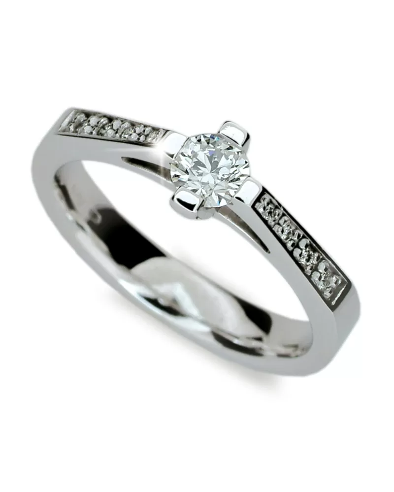 Zásnubný prsteň vyrobený z bieleho štrnásťkarátového zlata rýdzosti 585/1000 v lesklej povrchovej úprave s ôsmimi menšími a jedným väčším okrúhlym zirkónom. Prsteň máme na sklade aj v žltom zlate.