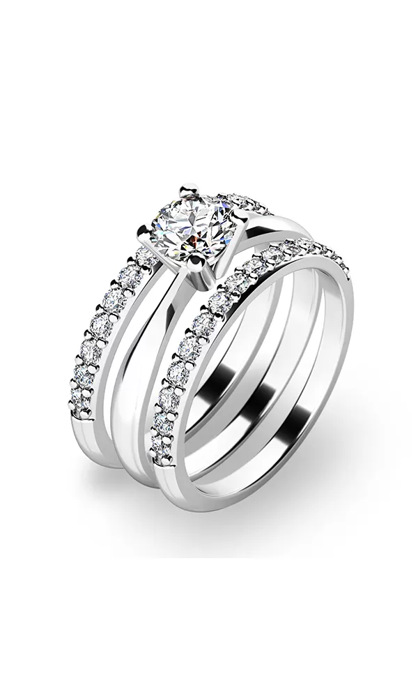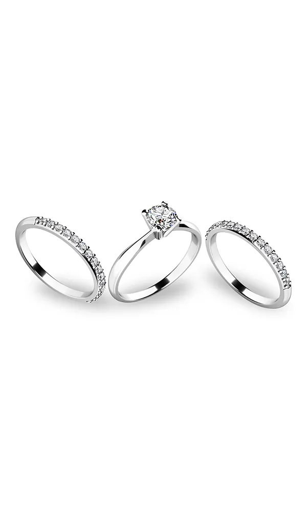 Krásny set prsteňov  10770 a dvoch  10845 zaujme na prvý pohľad. Prstene sú vyrobené zo štrnástich karátového bieleho zlata s rýdzosťou 585/1000 s lesklým povrchom. Hlavný prsteň je vysadený veľkým zirkónom v briliantovom bruse a každý krúžok pätnástimi kusmi menších zirkónov v jednej línii. Prstene pôsobia veľmi jemne a elegantne. Každá žena sa do tohto setu zamiluje a zaujme s ním okolie.
