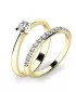 Hľadáte zaujímavý zásnubný prsteň? Chcete zaujať netradičným kúskom? Presne pre vás tu máme tento krásny set prsteňov. a  10845, ktorý si vaša milovaná zamiluje. Prstene sú vyrobené zo štrnástich karátového žltého zlata s rýdzosťou 585/1000 s lesklým povrchom. Hlavný prsteň je vyrobený podľa moderných trendov a obsahuje jeden stredový okrúhly zirkón v briliantovom bruse. Krúžok je vysadený pätnástimi kusmi menších zirkónov v jednej línii.