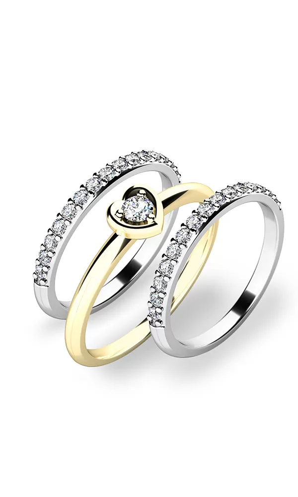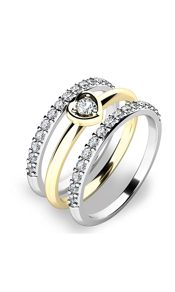Toužíte svou milovanou ohromit? Chystáte se jí zeptat na největší otázku v životě? Tento set zásnubních prstenů vám pomůže k dosažení odpovědi, po které toužíte. Tento krásný set se skládá z prstenů 10849 a dvou 10845, které vaší milovanou ohromí. Prsteny jsou vyrobené ze čtrnácti karátového žlutého a bílého zlata o ryzosti 585/1000 s lesklým povrchem. Hlavní prsten okouzlí vaší přítelkyni zářivým zirkonem vsazeným do tvaru srdce, který si vaše přítelkyně zamiluje. Dva kroužky jsou osazeny patnácti kusy menších zirkonů v jedné linii. Všechny zirkony mají briliantový brus Signity star, který zajišťuje maximální brilanci kamenů. Díky skladbě a stylově čistému vsazení zirkonů, prsten vyniká krásnou brilancí kamenů. Vsazování zirkonů do zásnubních prstenů provádějí naši nejzkušenější mistři zlatníci ručně pod mikroskopem s přesností na 0,01mm a proto nehrozí vypadnutí kamínků jako to bývá u strojně vyráběných zásnubních prstenů.