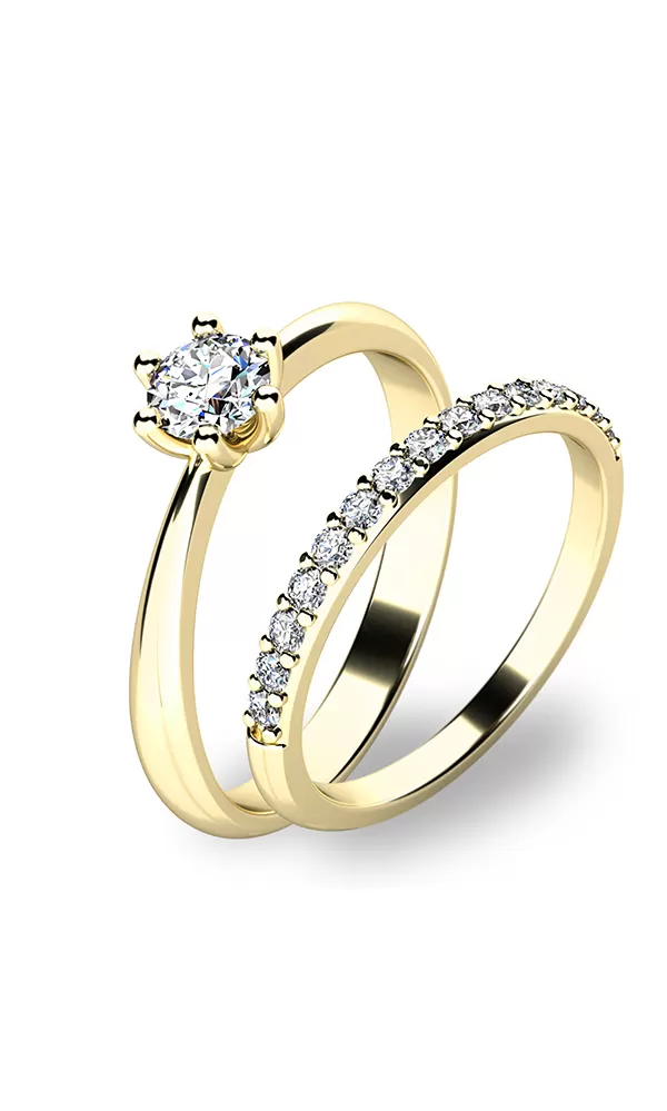 Krásny set prsteňov  10819 a  10845 Vás očarí na prvý pohľad. Prstene sú vyrobené zo štrnástich karátového žltého zlata s rýdzosťou 585/1000 s lesklým povrchom. Hlavný prsteň má jeden zirkón okrúhleho brusu, ktorý je uchytený do šesťkrapnovej korunky. Prsteň je čistého designu v klasickom prevedení, ktorý patrí stále k najobľúbenejším typom zásnubných prsteňov. Krúžok je vysadený pätnástimi kusmi menších zirkónov v jednej línii. Tento set si rozhodne zamiluje každá žena, ktorej ho darujete.