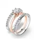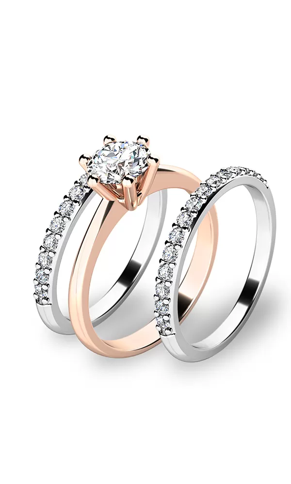 Krásny set prsteňov  10720 a dvoch  10845 vás aj vaše okolie zaujme na prvú pohľad. Prstene sú vyrobené zo štrnástich karátového ružového a bieleho zlata s rýdzosťou 585/1000 s lesklým povrchom. Hlavný prsteň je vysadený veľkým zirkónom v briliantovom bruse a dva krúžky pätnástimi kusmi menších zirkónov v jednej línii. Prstene pôsobia veľmi jemne a elegantne. Každá žena sa do tohto setu zamiluje.