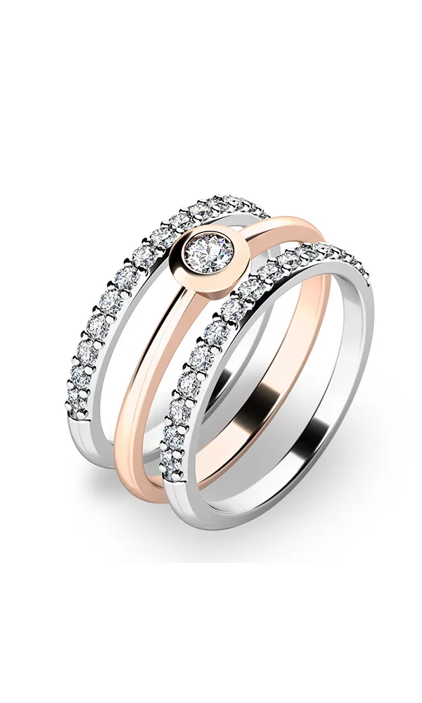 Krásny set prsteňov  10807  a dvoch  10845 Vás očarí na prvý pohľad. Prstene sú vyrobené zo štrnástich karátového ružového a bieleho zlata s rýdzosťou 585/1000 s lesklým povrchom. Všetky prstene žiaria mimoriadnym leskom a to vďaka zirkónom v briliantovom bruse. V hlavnom prsteni je vsadený "na hladko do obruby" jeden okrúhly zirkón. Dva krúžky sú osadené pätnástimi kusmi menších zirkónov v jednej línii.