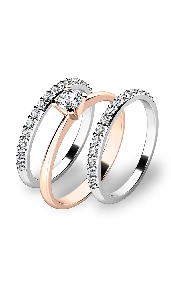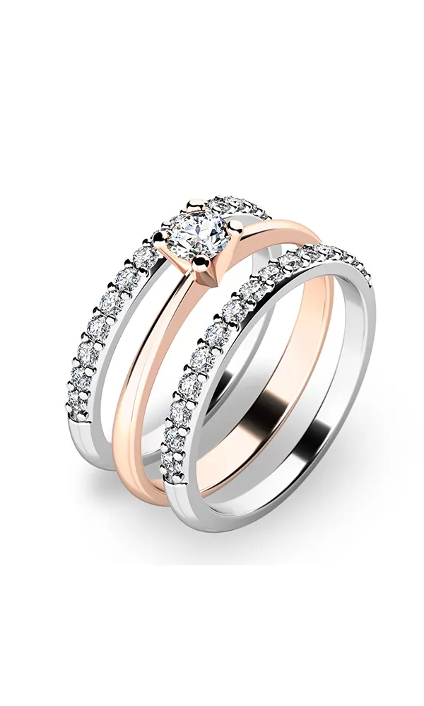 Krásný set prstenů 10820 a dvou 10845 vás okouzlí na první pohled. Prsteny jsou vyrobené ze čtrnácti karátového růžového a bílého zlata o ryzosti 585… Celý popis