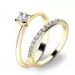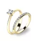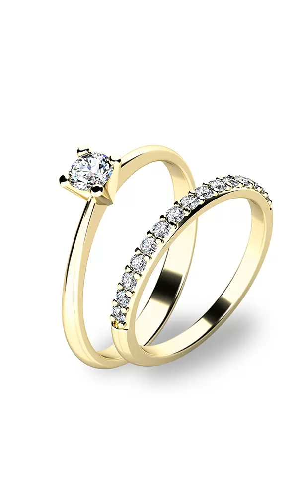 Krásný set prstenů 10820 a 10845 vás okouzlí na první pohled. Prsteny jsou vyrobené ze čtrnácti karátového žlutého zlata o ryzosti 585/1000 s lesklým povrchem. Oba prsteny září mimořádným leskem a to díky zirkonům v briliantovém brusu. Hlavní prsten má jeden kulatý zirkon uchycený do čtyřkrapnové korunky. Prsten je čistého designu v klasickém provedení, který patří stále k nejoblíbenějším typům zásnubních prstenů. Kroužek je osázen patnácti kusy menších zirkonů v jedné linii. Tento set si rozhodně zamiluje každá žena, které ho darujete.