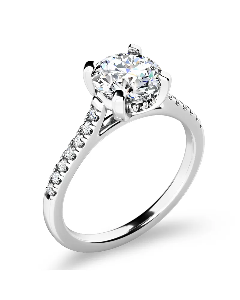 Tento zásnubný prsteň je vyrobený z bieleho štrnástich zlatých zlata - 585/1000 v lesklom povrchu. Prsteň má jeden hlavný dominantný zirkón okrúhleho mletia, ktorý je pripevnený k korunke Four -Track. Táto príloha pomôže zirkonu dokonale vynikať v jej kráse a brúsení. Krásny detail je nastavenie zirkónov na bok koruny. Na stranách v krúžku je nastavený 14 žiarivých zirkónov, ktoré zmäkčujú krúžok. Zásnubný prsteň bude ohromený z každej strany.  Všetky zirkóny majú vynikajúcu hviezdu podpisu, ktorá poskytuje maximálnu brilanciu kameňov. Vďaka kompozícii a štýlovo čistému vloženiu zirkónov prsteň vyniká v krásnej brilancii kameňov. Nastavenie zirkónov do zásnubných krúžkov vykonávajú naši najskúsenejší majstri rukou pod mikroskopom s presnosťou 0,01 mm, a preto neexistuje riziko, že kamene vypadnú ako strojové zásnubné krúžky.