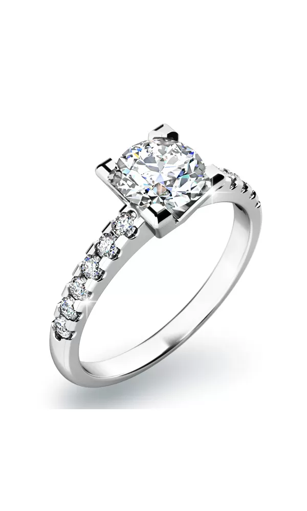 Žiarivý zásnubný prsteň vyrobený z bieleho štrnásťkarátového zlata - 585/1000 v lesklej povrchovej úprave. Prsteň je osadený okrúhlymi zirkónmi vybrúsenými briliantovým brusom - jedným výrazným stredovým zirkónom a po každej strane šiestimi menšími zirkónmi. Všetky zirkóny majú briliantový brus Signity star, ktorý zaisťuje maximálnu brilanciu kameňov. Vďaka skladbe a štýlovo čistému vsadeniu zirkónov, prsteň vyniká krásnou brilanciou kameňov. Vsadzovanie zirkónov do zásnubných prsteňov vykonávajú naši najskúsenejší majstri zlatníci ručne pod mikroskopom s presnosťou na 0,01mm a preto nehrozí vypadnutie kamienkov ako to býva u strojne vyrábaných zásnubných prsteňov.