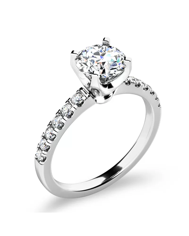 Zásnubný prsteň je vyrobený z bieleho štrnásťkarátového zlata - 585/1000 v lesklej povrchovej úprave. Prsteň má jeden hlavný dominantný zirkón okrúhleho brusu, ktorý je uchytený do štvorkrapňovej korunky. Toto uchytenie pomôže zirkónu dokonale vyniknúť jeho kráse a brusu. Po stranách v obrúčke prsteňa je vsadených 12 žiarivých zirkónov, ktoré prsteň zjemňujú. Všetky zirkóny majú briliantový brus Signity star, ktorý zaisťuje maximálnu brilanciu kameňov. Vďaka skladbe a štýlovo čistému vsadeniu zirkónov, vyniká prsteň krásnou brilanciou kameňov. Vsadzovanie zirkónov do zásnubných prsteňov vykonávajú naši najskúsenejší majstri zlatníci ručne pod mikroskopom s presnosťou na 0,01mm a preto nehrozí vypadnutie kamienkov ako to býva u strojne vyrábaných zásnubných prsteňov.