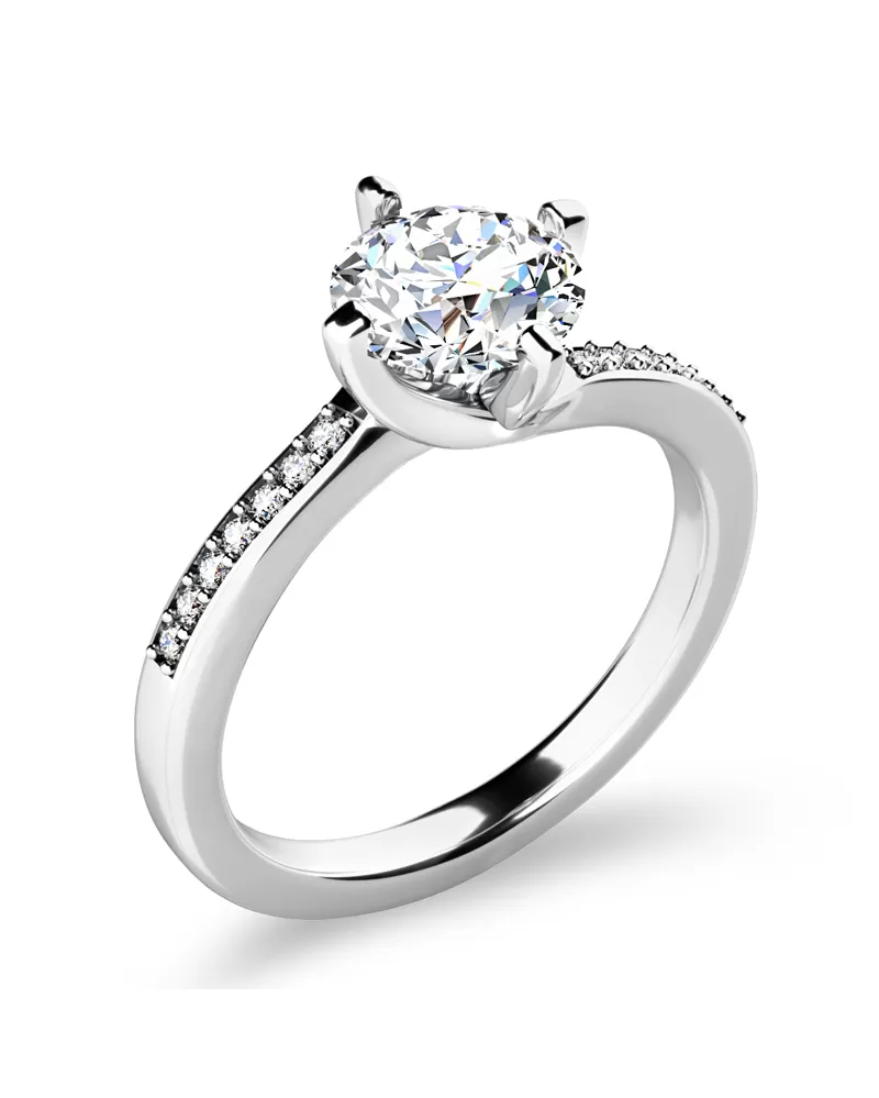 Zásnubný prsteň je vyrobený z bieleho štrnásťkarátového zlata - 585/1000 v lesklej povrchovej úprave. Prsteň má jeden hlavný dominantný zirkón okrúhleho brusu, ktorý je uchytený do štvorkrapňovej korunky. Toto uchytenie nechá zirkón dokonale vyniknúť v jeho kráse a bruse. Po stranách v obrúčke prsteňa je vsadených na každej strane 7 žiarivých zirkónov, ktoré prsteň zjemňujú. Všetky zirkóny majú briliantový brus Signity star, ktorý zaisťuje maximálnu brilanciu kameňov. Vďaka skladbe a štýlovo čistému vsadeniu zirkónov, vyniká prsteň krásnou brilanciou kameňov. Vsadzovanie zirkónov do zásnubných prsteňov vykonávajú naši najskúsenejší majstri zlatníci ručne pod mikroskopom s presnosťou na 0,01mm a preto nehrozí vypadnutie kamienkov ako to býva u strojne vyrábaných zásnubných prsteňov.