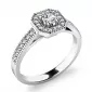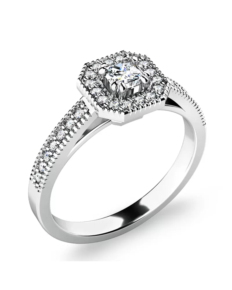 Zásnubný prsteň je vyrobený z bieleho štrnásťkarátového zlata - 585/1000 v lesklej povrchovej úprave. Prsteň má výnimočný dizajn, kde dominuje zirkón štvorcového brusu Princess, ktorý je uchytený do štvorkrapňovej korunky. Toto uchytenie nechá zirkón dokonale vyniknúť v jeho kráse a bruse. Okolo tohto zirkónu po celom obvode je vsadených 16 žiarivých okrúhlych zirkónov, ktoré prsteň zjemňujú. Pre dokonalé zvýraznenie prsteňa sú po stranách v obrúčke vsadených 7 ks okrúhlych zirkónov na oboch stranách. Všetky okrúhle zirkóny majú briliantový brus Signity star, ktorý zaisťuje maximálnu brilanciu kameňov. Vďaka skladbe a štýlovo čistému vsadeniu zirkónov, vyniká prsteň krásnou brilanciou kameňov. Vsadzovanie zirkónov do zásnubných prsteňov vykonávajú naši najskúsenejší majstri zlatníci ručne pod mikroskopom s presnosťou na 0,01mm a preto nehrozí vypadnutie kamienkov ako to býva u strojne vyrábaných zásnubných prsteňov.