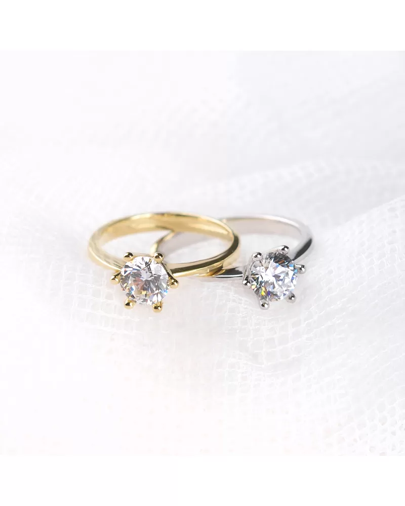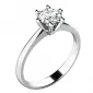 Žiarivý zásnubný prsteň typu soliter je vyrobený z bieleho štrnásťkarátového zlata - 585/1000 v lesklej povrchovej úprave. Prsteň má jeden okrúhly zirkón vsadený do šesťkrapňovej korunky. Zirkón je vybrúsený briliantovým brusom Signity star, ktorý zaisťuje maximálnu brilanciu kameňa. Vsadzovanie zirkónov do zásnubných prsteňov vykonávajú naši najskúsenejší majstri zlatníci ručne pod mikroskopom s presnosťou na 0,01mm a preto nehrozí vypadnutie kamienkov ako to býva u strojne vyrábaných zásnubných prsteňov.