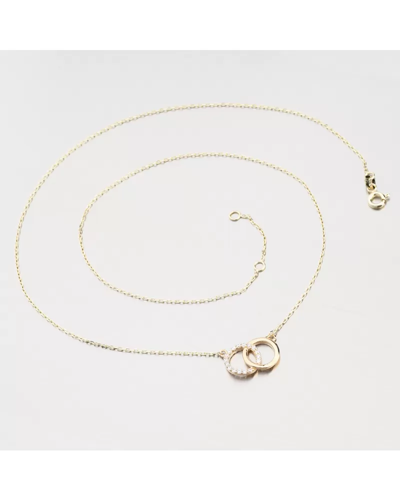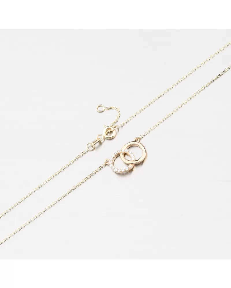 Jemný dizajn s hlbokým významom. Tento zlatý náhrdelník zdobí pár prepletených prsteňov, z ktorých jeden je osadený precízne brúsenými zirkónmi. Spolu vytvárajú harmonický zväzok, ktorý symbolizuje lásku, jednotu a nerozlučiteľné puto. Zirkóny sú briliantového brusu, ktorý zaisťuje maximálnu brilanciu brúsených faziet, dokonale odráža svetlo a neuveriteľne žiari z každého uhla pohľadu.