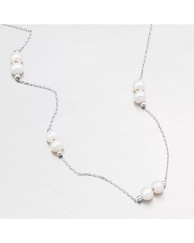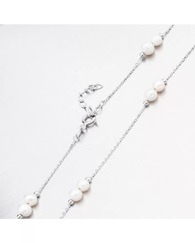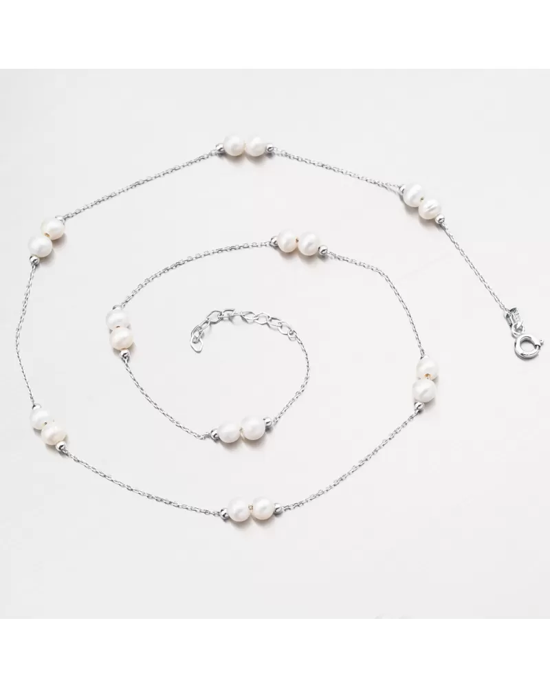 Zlatý náhrdelník, ktorý zapôsobí svojou jemnosťou a eleganciou. Náhrdelník pozostáva z reťazca typu ankeru a na ňom striedajú po celej oblasti dve biele sladkovodné perly končia malými lesklými guľami. Určite potešíte milovaného človeka s týmto náhrdelníkom.