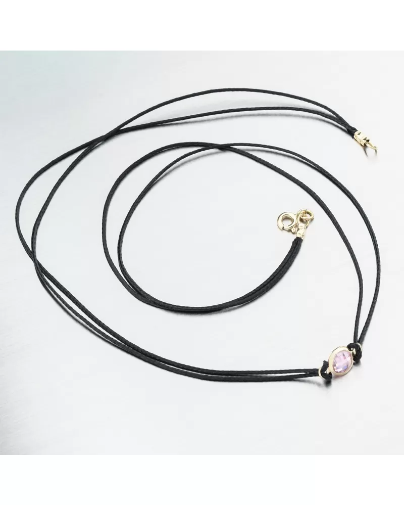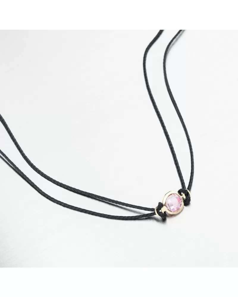 Objavte šnúrový náhrdelník so zlatým príveskom - ručne vyrobený šperk, ktorý spája štýl, symboliku a luxus v jednom. Retiazka je vyrobená z čiernej dvojitej šnúrky, ktorú v samom strede zdobí prívesok zo žltého zlata. Centrálny prívesok zdobí precízne vybrúsený ružový zirkón, ktorý sa pri každom pohybe krásne leskne a dodáva náramku iskru skutočného luxusu.