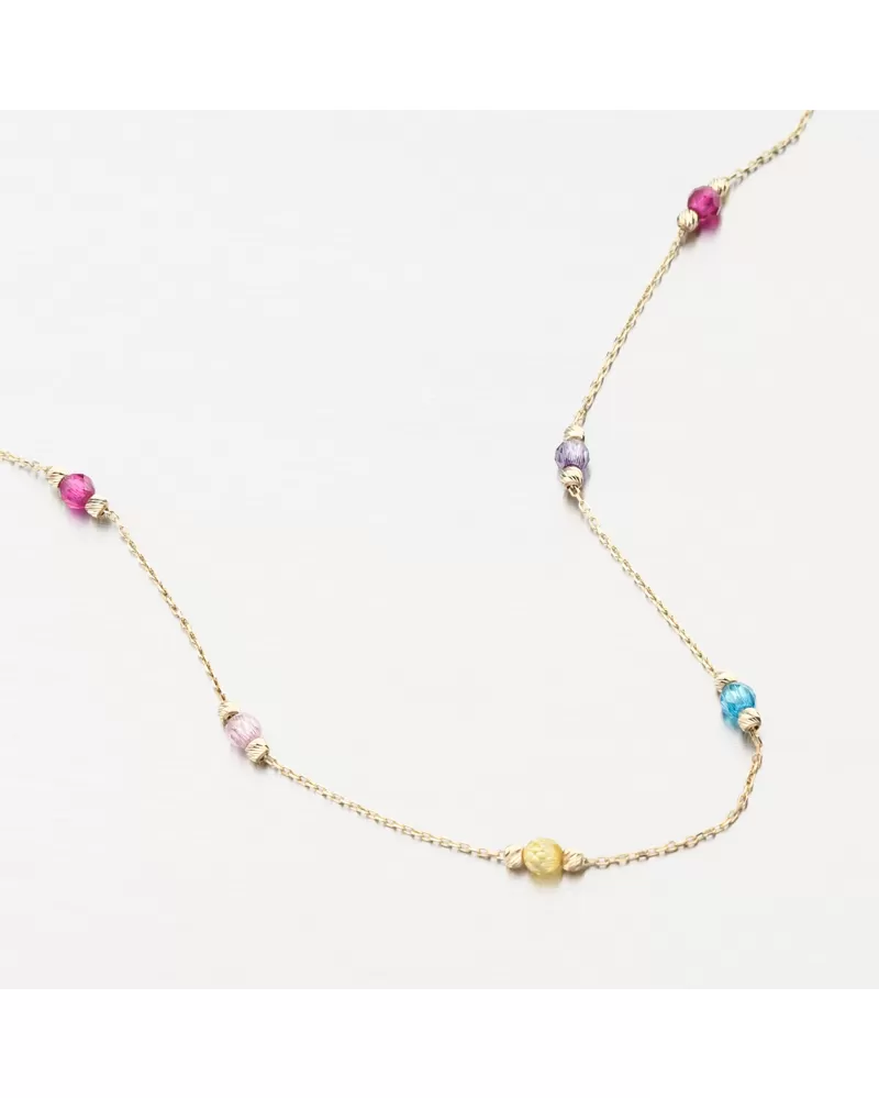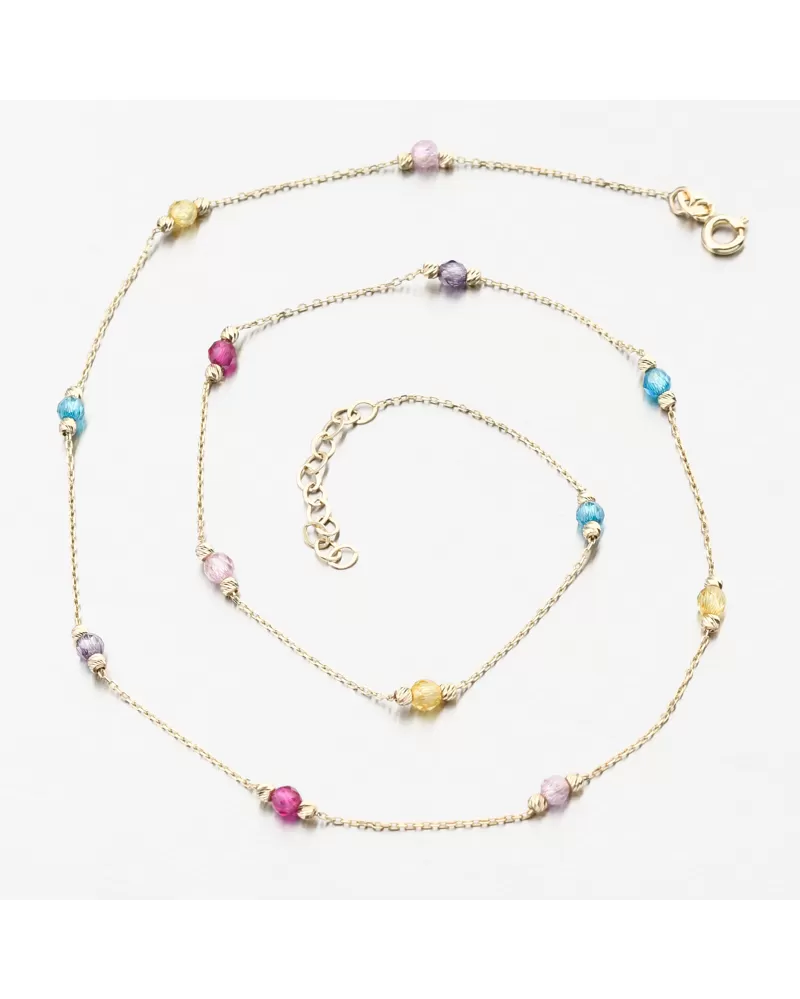 Tento zlatý náhrdelník vás oslní svojím spracovaním na prvý pohľad. Budete mať záujem o najfarebnejšie zirkóny pozdĺž celej dĺžky náhrdelníka, kde sa striedajú jednotlivé farby. Zirkóny sú rezané a zlaté gule sú zdobené gravírovaním na každej strane. Gravírovanie je pomocou diamantovej špičky, ktorá dáva šperku maximálny lesk a brilanciu zo všetkých uhlov. Určite urobíte príjemcu spokojným s týmto náhrdelníkom.