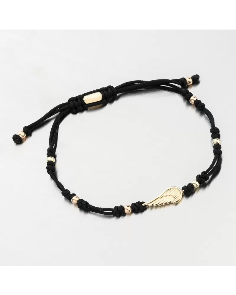 Veľmi obľúbený typ povrázkového náramku, ktorý má výhodu vo svojej univerzálnej veľkosti a obľúbenej čierno-zlatej kombinácii farieb. Náramok je tvorený z čierneho dvojitého povrázku, ktorý je ozdobený zlatými malými guličkami vo vysokom lesku a príveskom v samotnom strede zo žltého zlata v tvare anjelského krídla.