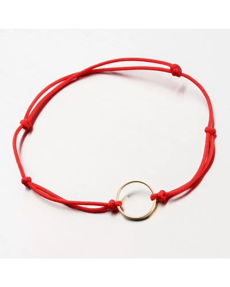 Veľmi obľúbený typ povrázkového náramku, ktorý má výhodu vo svojej univerzálnej veľkosti a obľúbenej červeno-zlatej kombinácii farieb. Náramok je tvorený z červeného dvojitého povrázku, ktorý je ozdobený príveskom v samotnom strede zo žltého zlata v tvare kruhu.