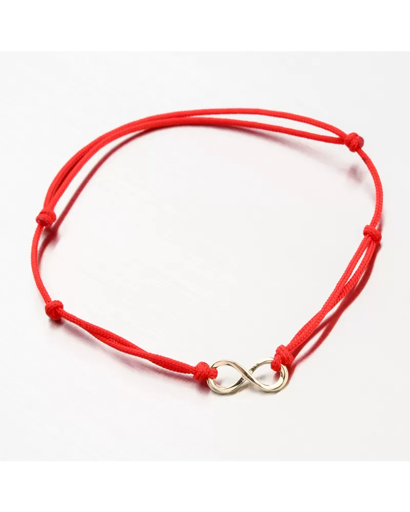 Veľmi obľúbený typ povrázkového náramku, ktorý má výhodu vo svojej univerzálnej veľkosti a obľúbenej červeno-zlatej kombinácii farieb. Náramok je tvorený z červeného dvojitého povrázku, ktorý je ozdobený príveskom v samotnom strede zo žltého zlata v tvare nekonečna.